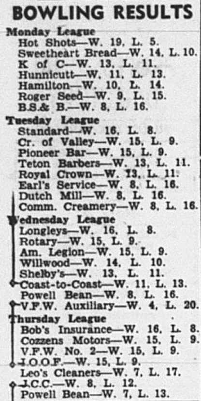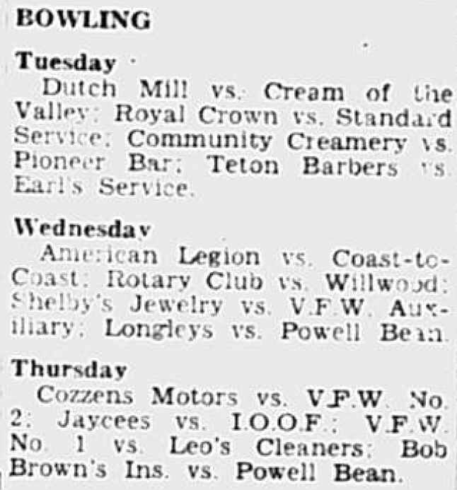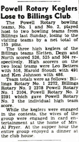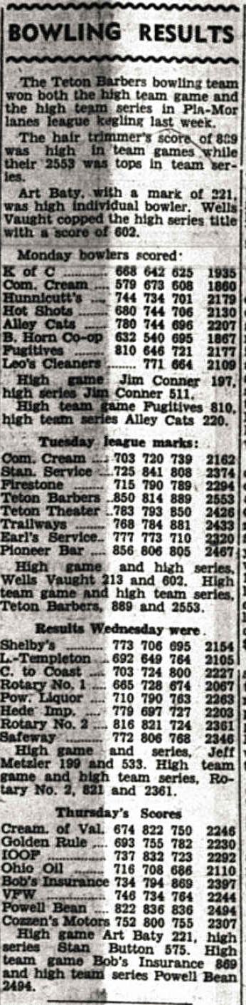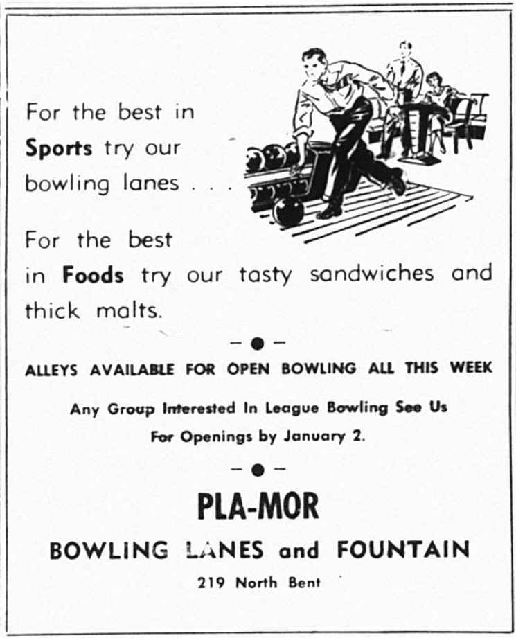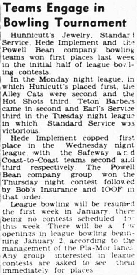 In July 1945, Sgt. Art Litton acquires the Powell bowling alleys from Clyde Caraveau but subsequently sells the lanes to Ed Strange in Jan 1947. O. L. Kasinger and his brother Ray bought the building from Allen Klindt in July 1947 and had it renovated for the new Play-Mor Bowling Lanes by November. By January 1949, O. L. and Ray Kasinger sold the Play-Mor Bowling Lanes to Harold Hergenraeder and Alex Fink. Harold Hergenraeder and Alex Fink were the owners/managers of the alleys at 213 Bent per the 1950 Rocky Mountain Business Directory. On June 18, 1950, the exterior wall of the bowling alley collapsed during construction efforts of the Peter Kranz's new Gamble's hardware store (223 N Bent St). Harold Hergenraeder was the owner/manager of the alleys at 213 Bent per the 1950 Rocky Mountain Business Directory. The reference to Play-Mor Lanes in the Lion/Trapper College Yearbook with a phone number of 799 (different than Pla-Mor Lanes phone number SK 4-2422) suggests it was on Bent St, not Clark St, need to confirm. Myron Heny owned the Powell Bowling Lanes on Clark St in 1963 and actually set pins at this location by hand when he was a kid in the late 1940s. |